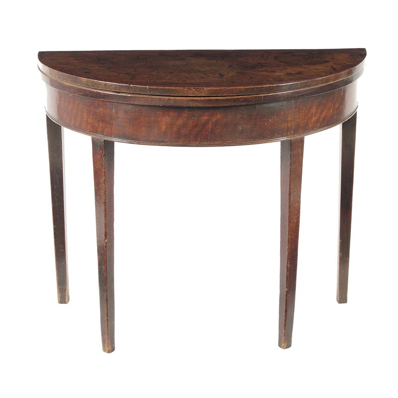 A George III mahogany demi-lune tea table, the fold-over top to twin gate supports, 27in (68.7cm) h, 33in (83.8cm) w, 16in (40.5cm) d.