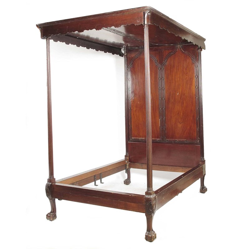 A mahogany four poster bed in George III style, the shaped canopy to blind fret carved Gothic arch decoration with fluted column supports to carved claw and ball feet and brass castors, 93in (236.3cm) h, 57.5in (145.8cm) w, 80.5in (204.9cm) l.