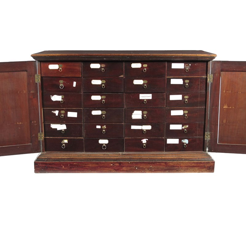 A George II mahogany dwarf cabinet, the crossbanded moulded edge top above a pair of fielded panel doors enclosing a bank of twenty four drawers each with a brass plaque engraved a letter and a ring handle, to a moulded edge and a later plinth base, 35in (89cm) h, 53.75in (136.3cm) w, 22.25in (56.5cm) d. Some handles replaced, and some lettered plaques off.