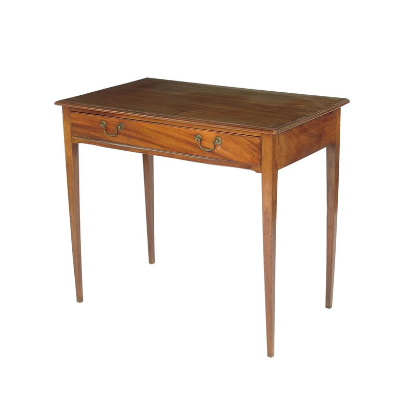 A mahogany side table, the moulded edge top above a frieze drawer and on square tapering legs, George III and later, 29.75in (72.8cm) h, 33in (83.4cm) w, 19.25in (48.8cm) d. Top sun faded.