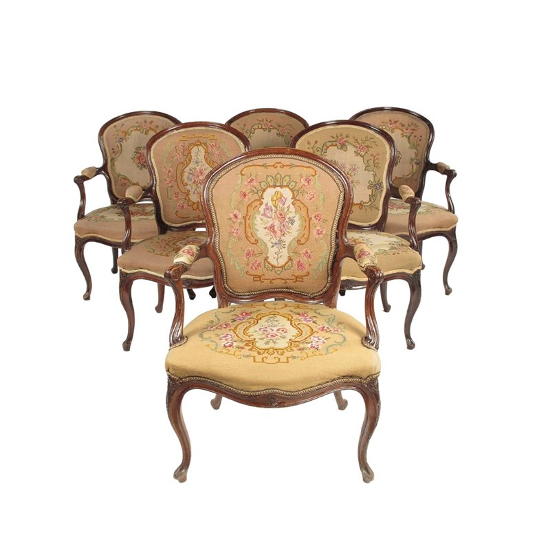 A set of six George III mahogany open armchairs in 'French Hepplewhite' style, each with a cartouche shape back and moulded and scroll arms, upholstered later gross point needlework, the serpentine seat on slender cabriole legs carved husks and foliage, one with two paper labels printed 'YARDLEY' and inscribed in pencil 'V. YARDLEY', with later floral covers. (6) Old repairs.