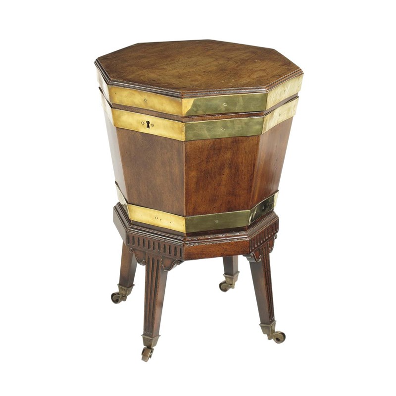 A mahogany and brass bound octagonal wine cooler in George III style, the hinged top to a lead line interior, the tapering body to a fluted frieze and bracketed fluted legs terminating in brass caps and castors, 2nd haf 19th century, 25.5in (64.3cm) h, 18.5in (46.8cm) w.