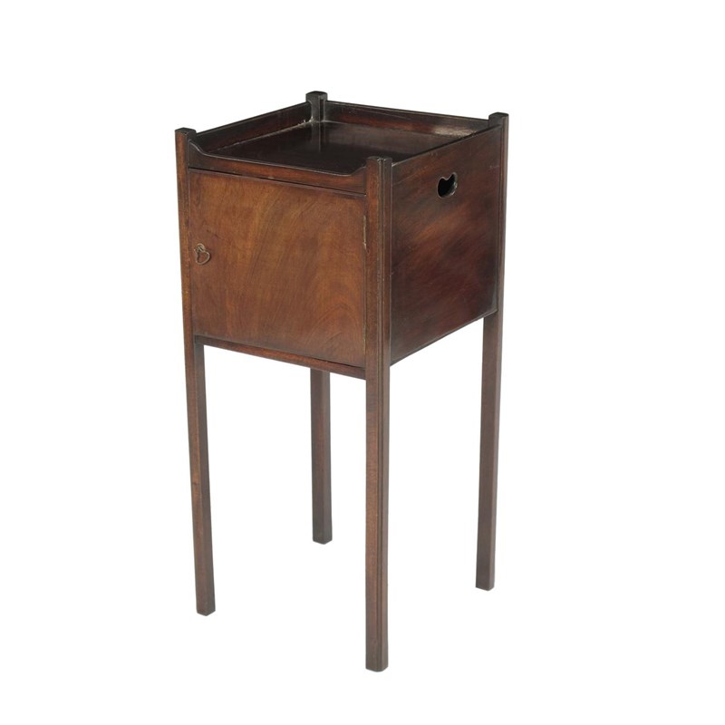 A mahogany pot cupboard, the sides with pierced handgrips, on chanelled supports, 30in (76.3cm) h, 13.75in (34.7cm) w, 14in (35.3cm) d.