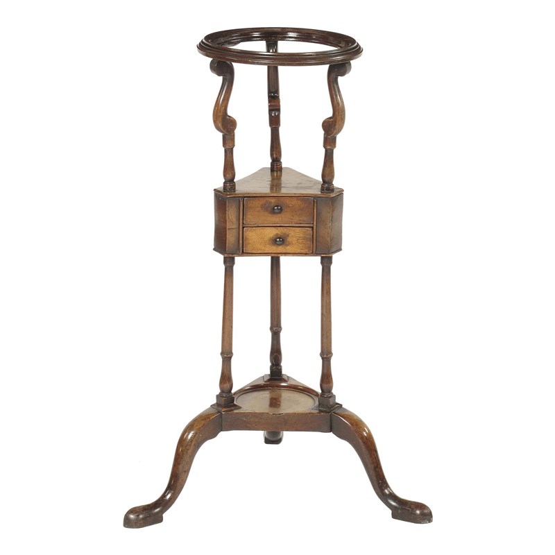 A George II mahogany wig or basin stand, the circular pierced top above two drawers and on tripod cabriole legs and pad feet, 31.75in (80.5cm) h, 20.5in (51.8cm) w.