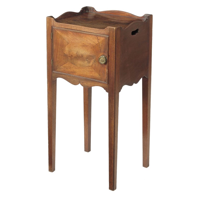 A George III mahogany bedside cupboard, with a shaped galleried top above pierced hand grips to either side, the door with an oval panel and reeded mouldings above arc d'arbelet aprons and moulded square tapering legs, 30.75in (77.9cm) h, 15in (38cm) w, 13.75in (35cm) d.