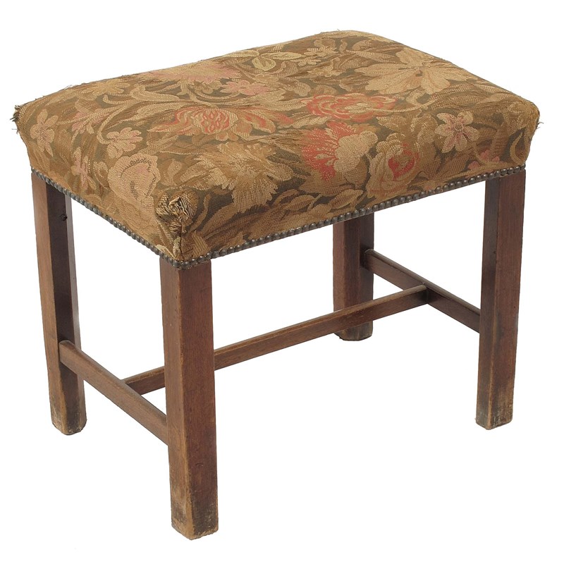A mahogany stool, the upholstered seat on chamfered supports united by an 'H' stretcher, 18in (45.7cm) h, 21.75in (55.2cm) w, 15.75in (40cm) d.