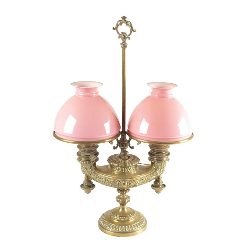 A 19th century German cast brass twin light oil lamp, converted to electricity, stamped 'PATENT WILD & WESEL, BERLIN', having pink opaque glass shades on an adjustable frame, 24.5in (62cm) h, 16in (40.5cm) w.