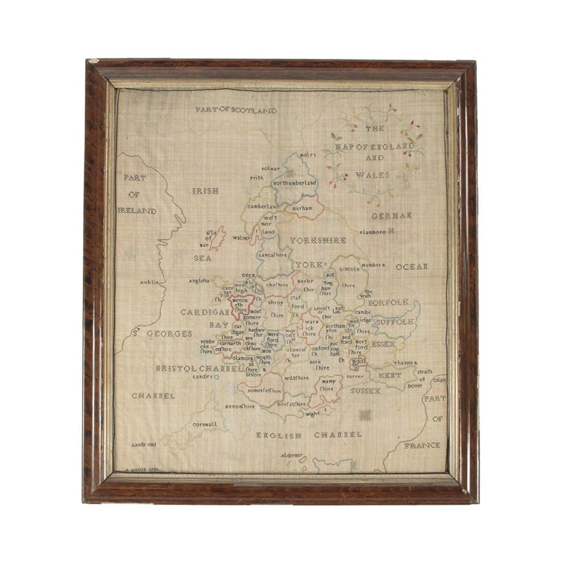 A late George III needlework Map of England and Wales, by A. Anson, dated 1791, the title with a floral border, 25 x 21.5in (63.5 x 53.5cm) in a later rosewood frame.