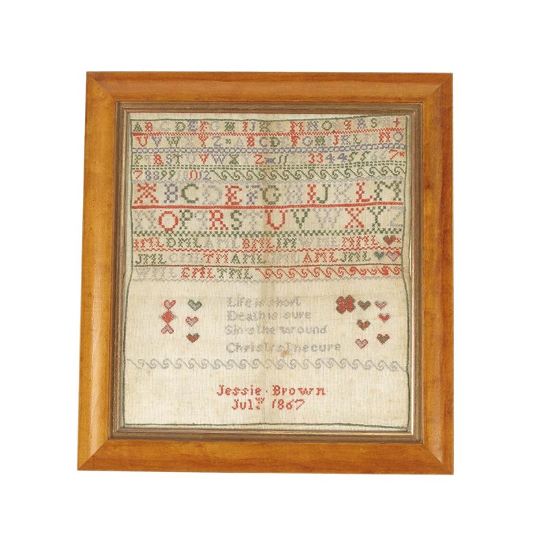 A Victorian needlework sampler, by Jessie Brown, July 1867, worked with alphabets, numbers, hearts and a verse 'Life is short, Death is sure, Sin's the wound, Christ's the cure', 13.25 x 12in (33.8 x 30.5cm), in a later glazed bird's eye maple frame.
