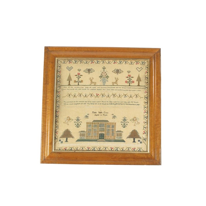 An early 19th century needlework sampler, by Edith Smith Cross, worked with a large country house, flanked by trees and putti, with butterflies, deer, urns of flowers, trees and verse with a floral outer border, 18.25 x 18.5in (46.5 x 47cm) within a later glazed and bird's eye maple frame.