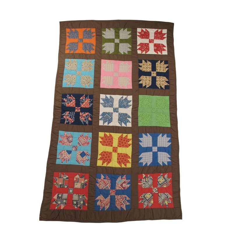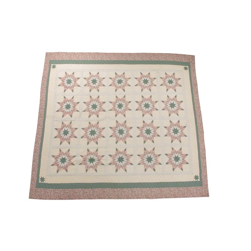 A twenty star quilt, each bordered with three further outer borders, 100.5 x 93in (255 x 236cm) and another with fifteen squares with stylized birds, 109 x 64in (277 x 162.5cm). (2)