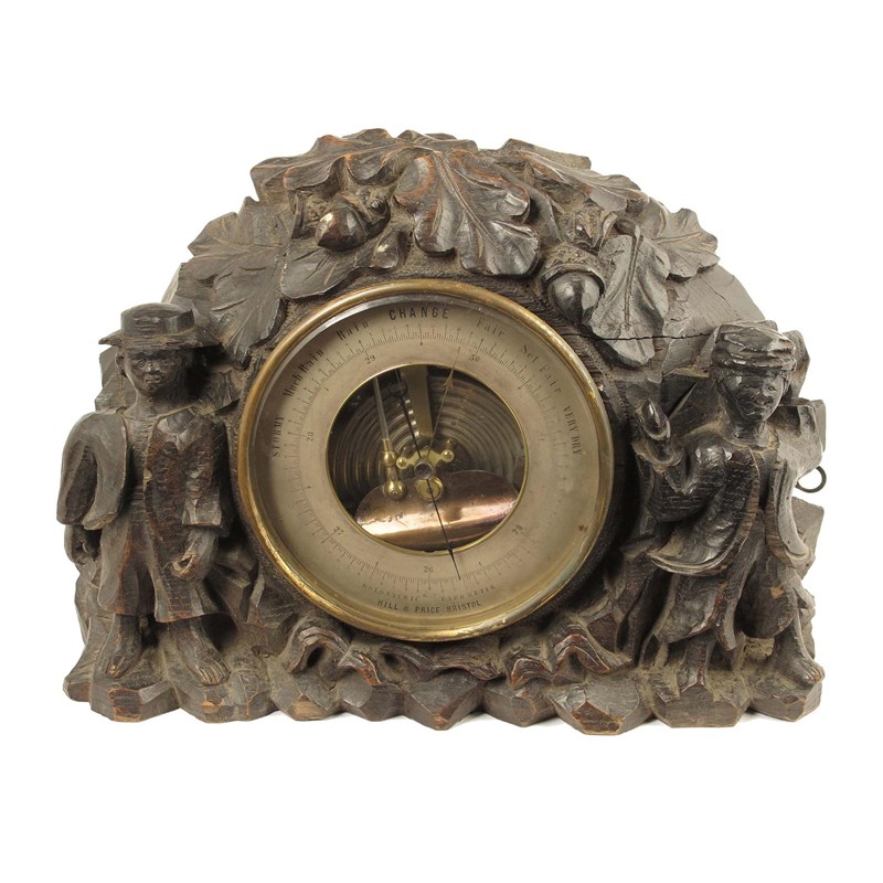 A late Victorian holosteric barometer by Hill & Price, Bristol, the carved oak case decorated with oak leaves and acorns and with two figures, the brass bezel to a silvered dial numbered '6557' and visible mechanism, 8in (20.1cm) h, 11.25in (28.3cm) w.