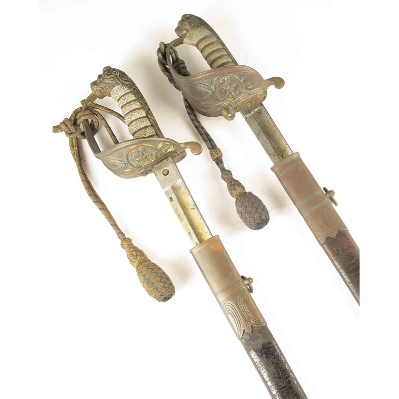 A Naval Officer's dress sword, with an etched blade by Walton, with owner's name 'H.S. BURNISTON', guard with folding side clip, snake skin bound handle and lion's head pommel, in a leather and brass bound scabbard, together with a similar sword by Wilkinson. (4)
