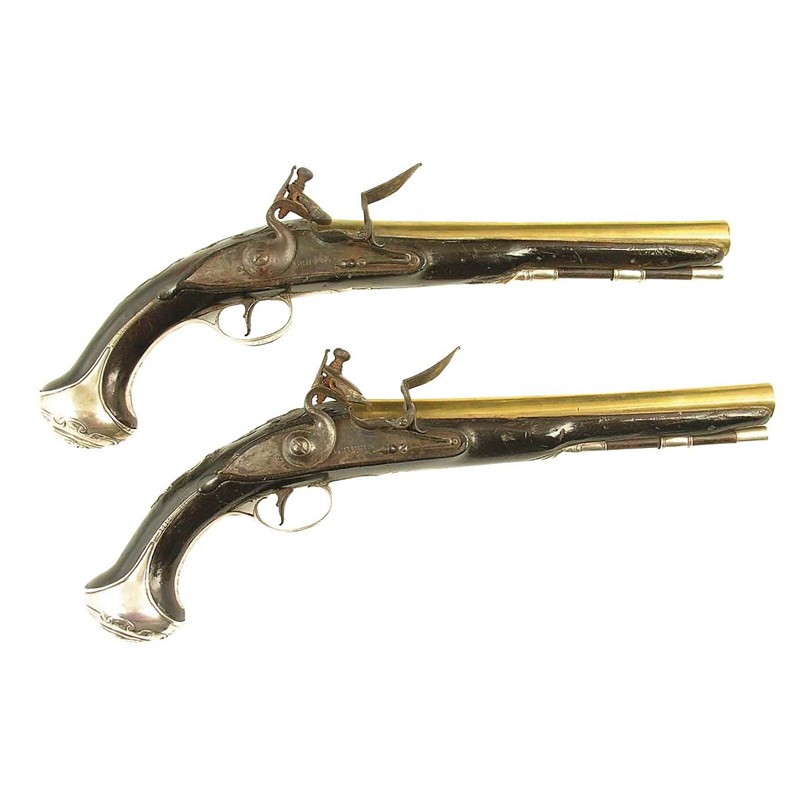 A pair of George III silver mounted flintlock pistols by Joseph Griffin, London, each with a 9in brass barrel inscribed GRIFFIN LONDON, stained walnut stocks with bulbouus butts, carved shells around the tang, the locks inscribed GRIFFIN, the silver mounts including a flower engraved trigger guard, ram rod locators, cast and chased grotesque butt caps, vacant cartouches and open scroll and shell side plates, maker I.K, London 1769, with ram rods. (2)