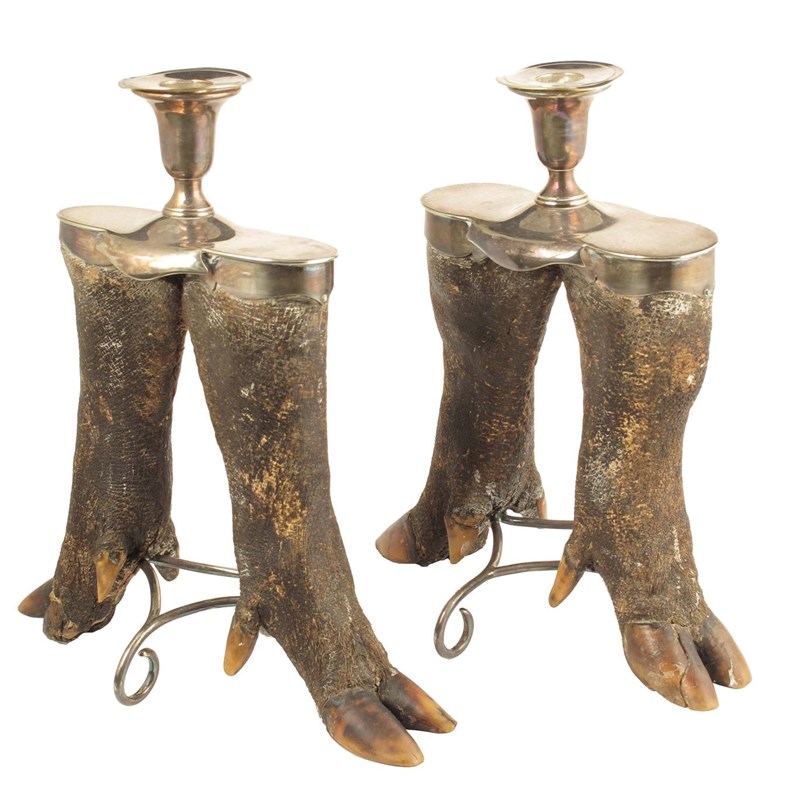 Rowland Ward. A pair of silver plated boar hoof candlesticks, with scroll bases, the inside of each sconce stamped 'ROWLAND WARD LIMITED 167 PICCADILLY', 11in (27.7cm) h, 10in (25.3cm) w. (2)