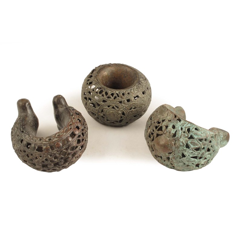 Two African pierced and hollow bronze crescent shape bangles, and another similar bangle. (3)