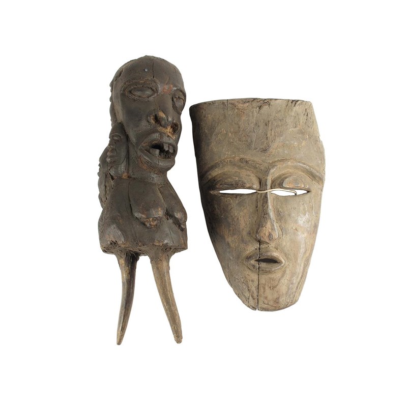 An AFrican carved group, of a female mask and four others on horn tripod legs, previously with horns to the top, 20.5in (52cm) h and a shield shape mask. (2)