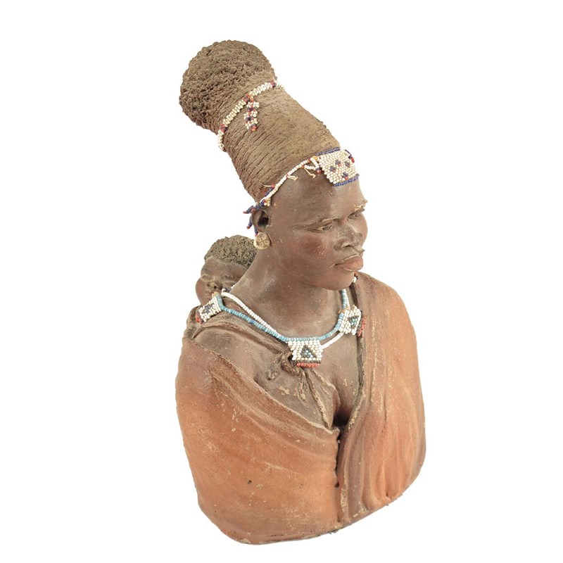 A West African pottery bust, of a lady with a conical and bulbous coiffure and wearing beads and carrying a sleeping child on her back, the reverse indistinctly signed and dated 1954, 11.25in (28.5cm) h.