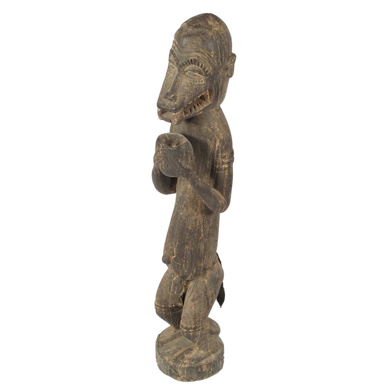 A Baule Gbekre standing figure, the head carved with serrated eyebrows and an open mouth bearing teeth and two fangs, holding a bowl to it's mouth, 41in (104cm) h.