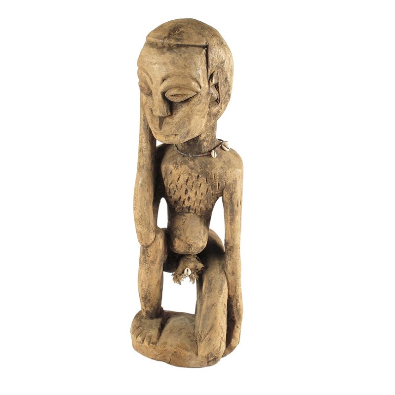 An African carved crouching male figure, with bead and shell necklace and a loin cloth, 25in (63.5cm) h.