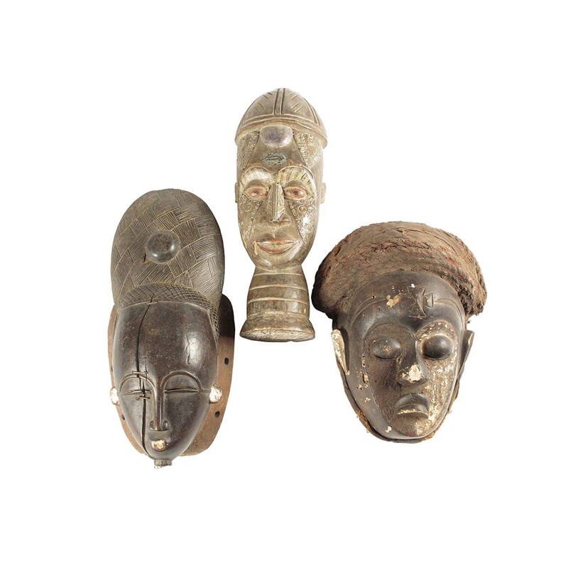 A Yaure mask, with a high plaited coiffure with white pigments to the ears and mouth, large crack through face with four staples, 15.5in (39.5cm) h, another West African mask with plaited fibre coiffure and a carved head with metal mounts. (3)