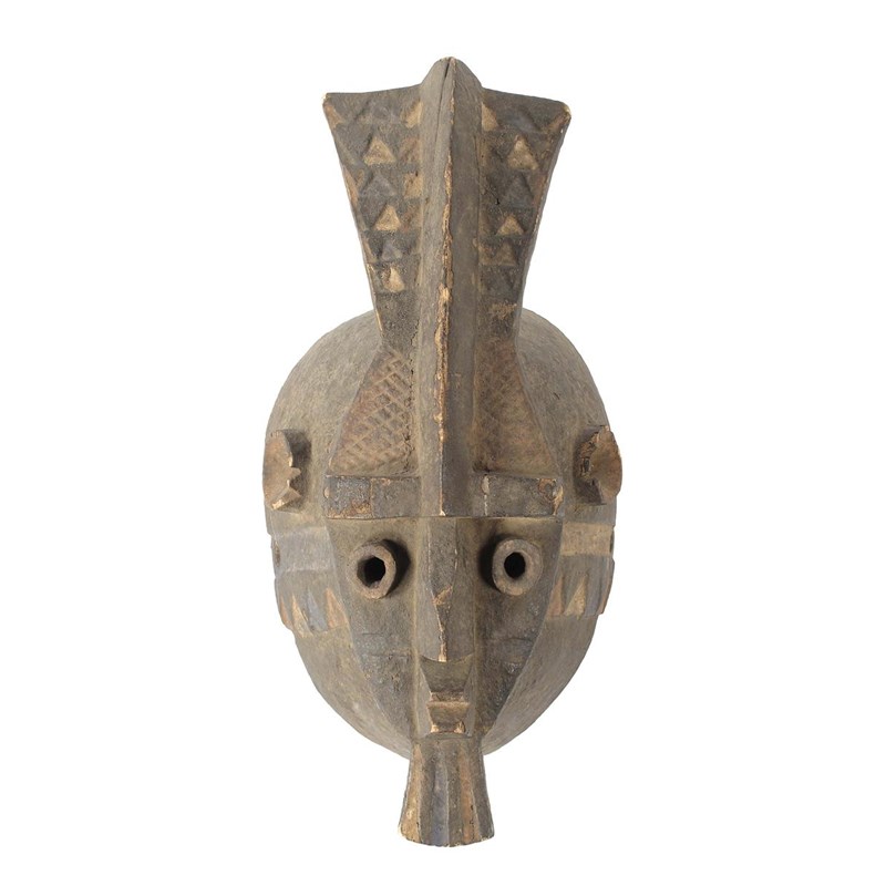 A Mossi mask, Burkina Faso with an ebonised ground with red, blue and white pigment to the triangular headpiece and short beard, two fastening holes to the sides, 17.5in (44.5cm) h.