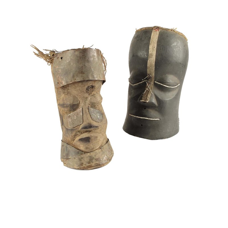 A West African helmet mask, with applied copper plates, 13.5in (34cm) h, and an ebonised wood helmet mask with applied beads. (2)