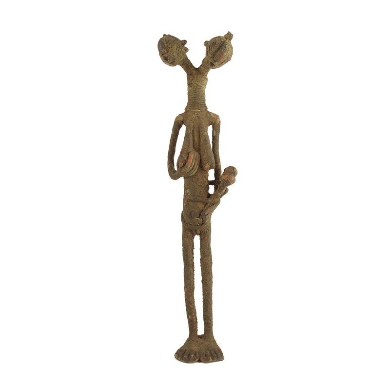 A West African metal two headed female figure, standing holding her right breast and a two headed infant, 12.5in (32cm) h.