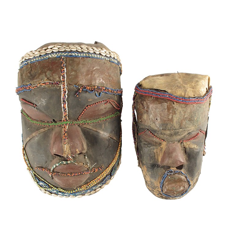 A West African large mask, with applied copper, beads and shells with an ebonised ground and painted red features, 17.5in (44.5cm) h, and another similar smaller mask. (2)