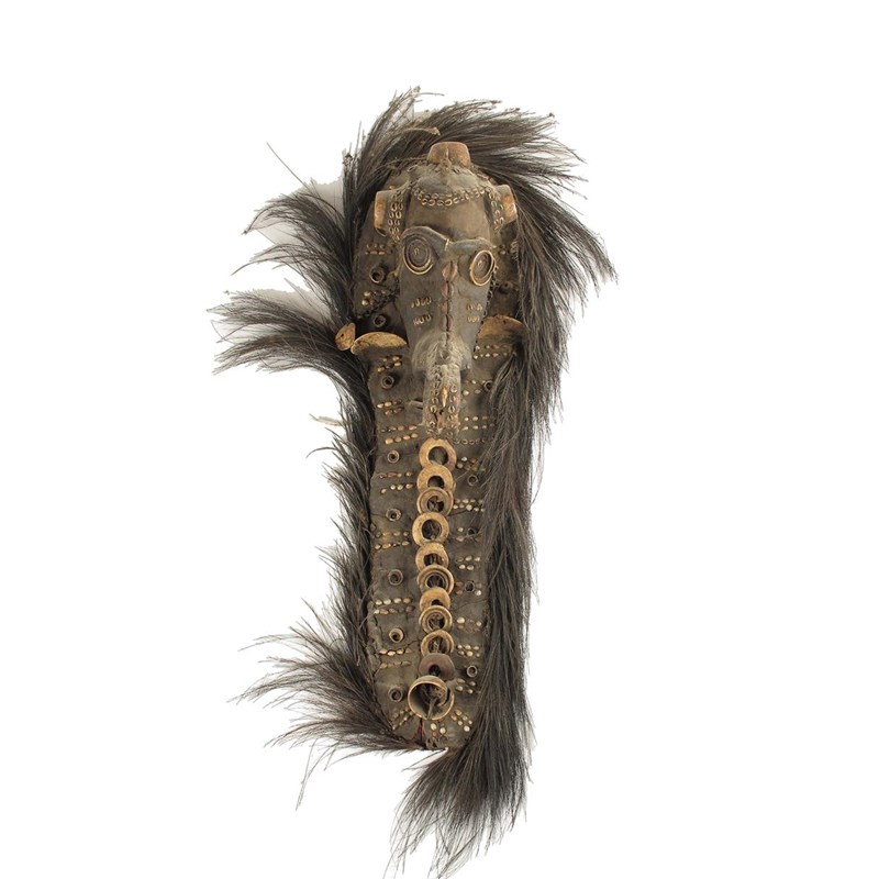 A Sepik ancestor mask, of shield form decorated tusks, cowrie shells, resin and feathers, the protruding mask with a long circular nose, with a wickerwork backing, 34in (86cm) h.