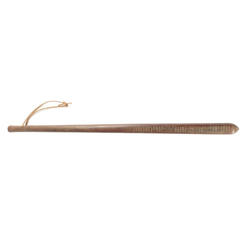 A Melanesia hardwood club, the squared shaft with incised and filled line decoration, the handle with a pierced hole, 46.25in (117.5cm) l.