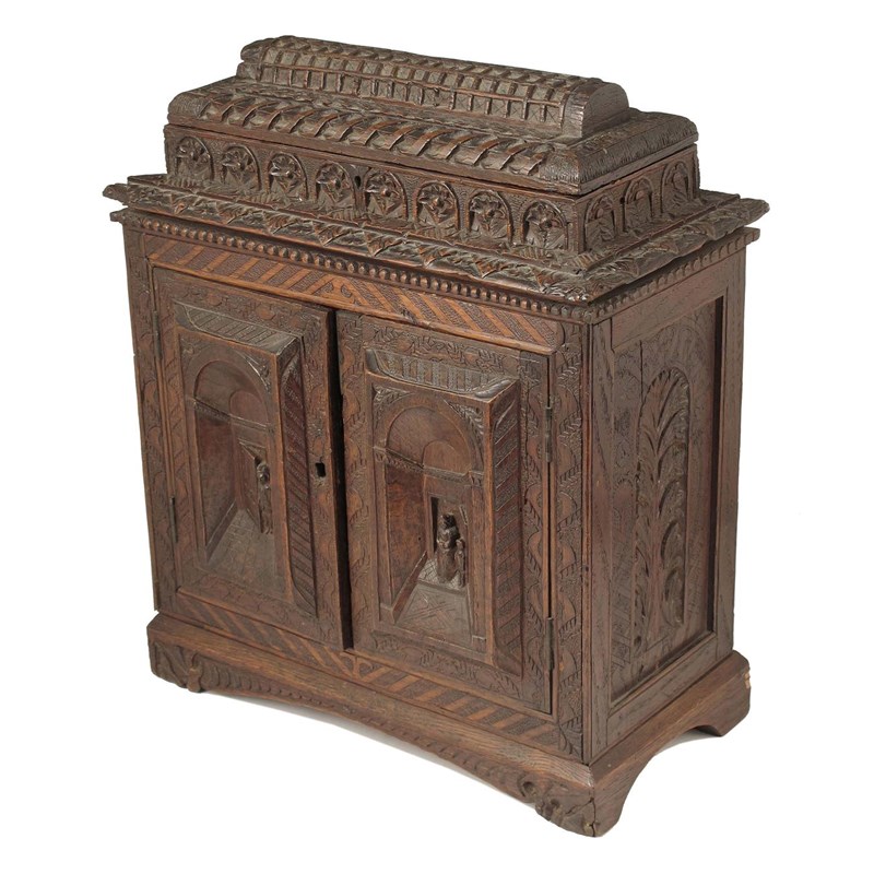 A 19th century carved oak cabinet, the lidded top with a domed ridge, having linen fold to one end above a petal carved frieze and edge, above a pair of panelled doors with recessed arches and carved figures in a doorway, enclosing plush lined shelves and a drawer, the panelled sides carved central stiff leaf within an arch, 17in (43cm) h, 14.5in (37cm) w, 8in (20.5cm) d.