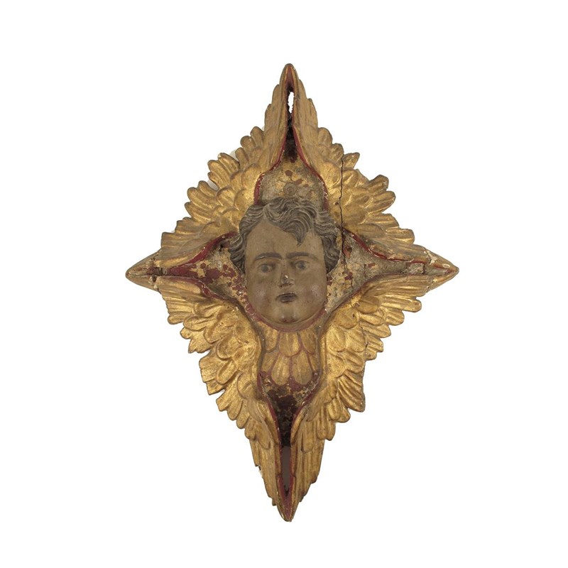 A giltwood and polychrome decorated angel mask wall applique, Italian or Spanish, 17th / 18th century, 21.5in (54.5cm) l, 15.5in (39cm) w.