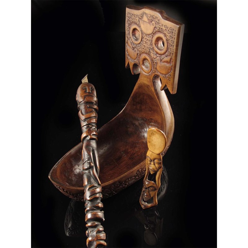 An unusual 19th century carved walking cane, the handle with a man issuing a scroll of vellum and faint handwriting from the top of his head, with animals around his body, the shaft with further animals and serpents with bead eyes, the base with another human figure, his hinged chest revealing an arrow through his heart with a further scroll of handwritten vellum behind, to a serpent and a brass tip, 33.5in (85cm) l, together with a Lega type bone carving and a Scandinavian wooden drinking vessel. (3)