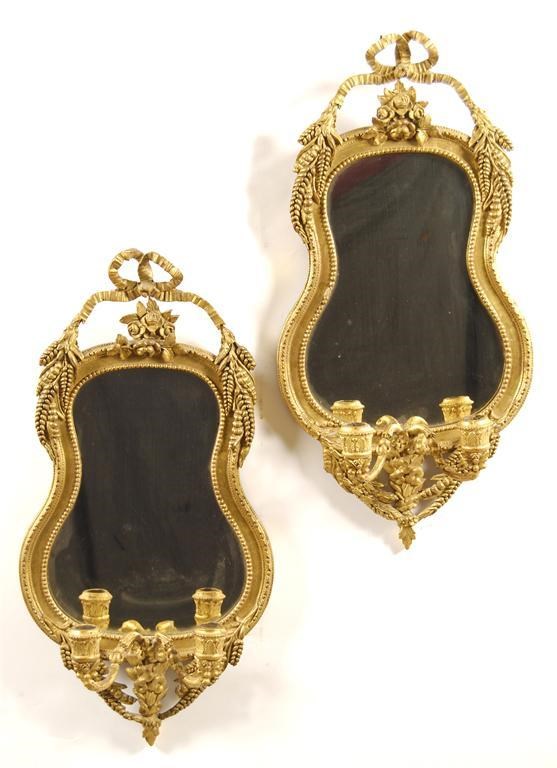 A pair of 19th century giltwood and gesso girandoles, of cartouche shape each with a ribbon tied surmount to husks of wheat, the conforming base with twin candle branches, 28.5 x 14in (72.2 x 35.6cm). (2) Old damages and restorations.