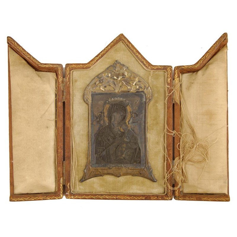 A silver coloured metal icon, depicting the Virgin Mary with baby Jesus, within an Art Nouveau frame, inscribed 'B. Wicker GR'. 3.75in (9.5cm) h, in a folding leather frame.