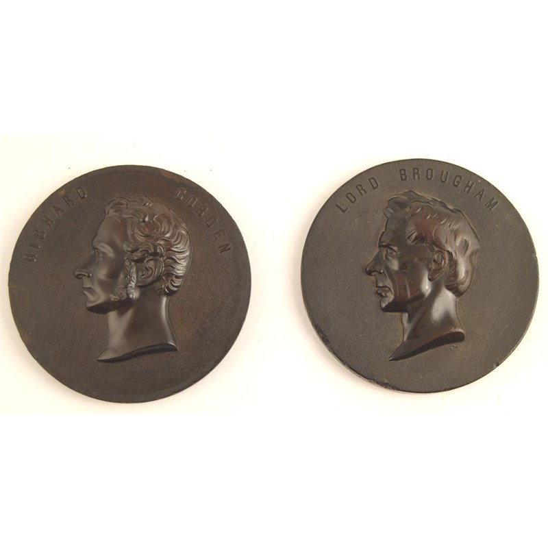 Two bois durci circular portrait medallions, Lord Brougham and Richard Cobden, 4.5in (11.5cm) dia.