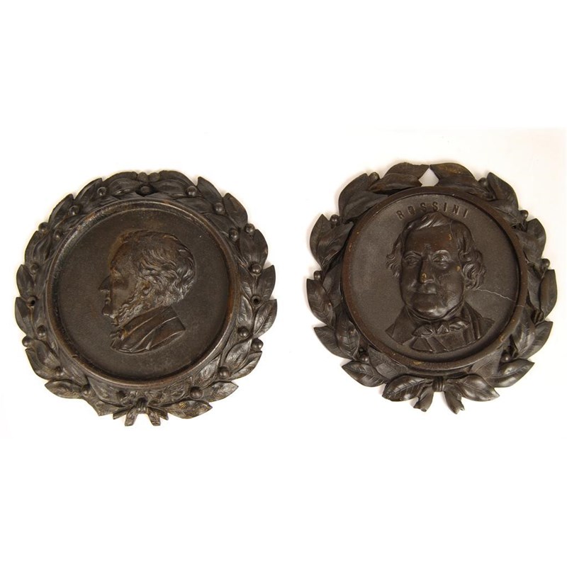 A bois durci portrait medallion, Rossini, with a laurel wreath border, 6.5in (16.5cm) dia, and another depicting Wagner. (2)