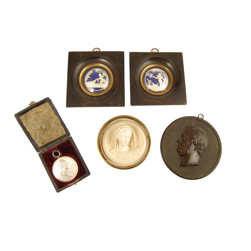 A Bois Durci circular medallion portrait bust, 'CONTE CAMILLO BEUSO DI CAVOUR', 4.5in (11.5cm) dia, two circular reliefs, Cupid, 2.25in (6cm) dia, a portrait relief bust of a lady, signed 'MATTEI', and a medallion. (5)