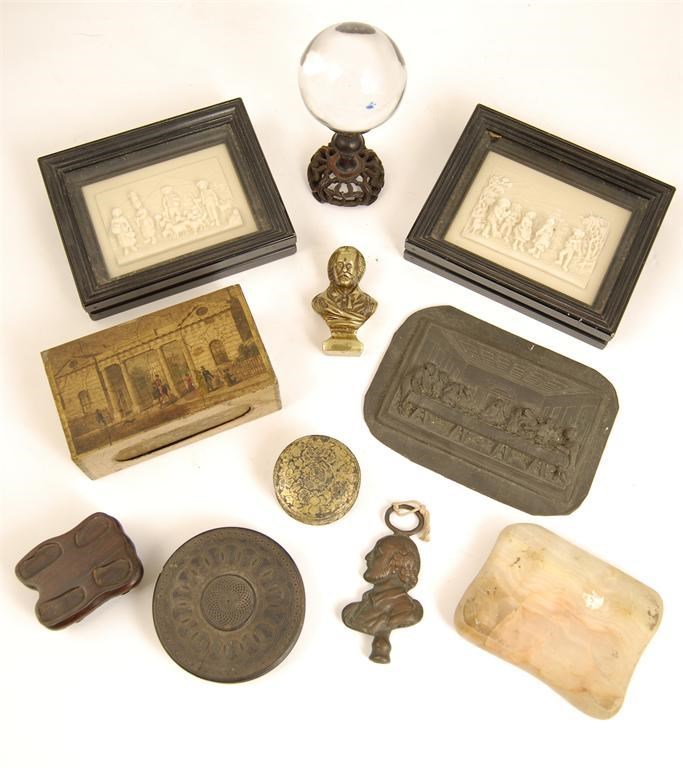 A pair of continental resin relief panels, Alpine scenes with rural figures, 3 x 4in (7.5 x 10cm) framed, a bronze panel The Last Supper, a glass sphere on pierced hardwood stand, a painted tine match box, with a printed view of GATE, a 19th century gilt overlaid circular box and cover, an ornamentally turned ebony box and cover, with two wax seals, and two busts. (10)
