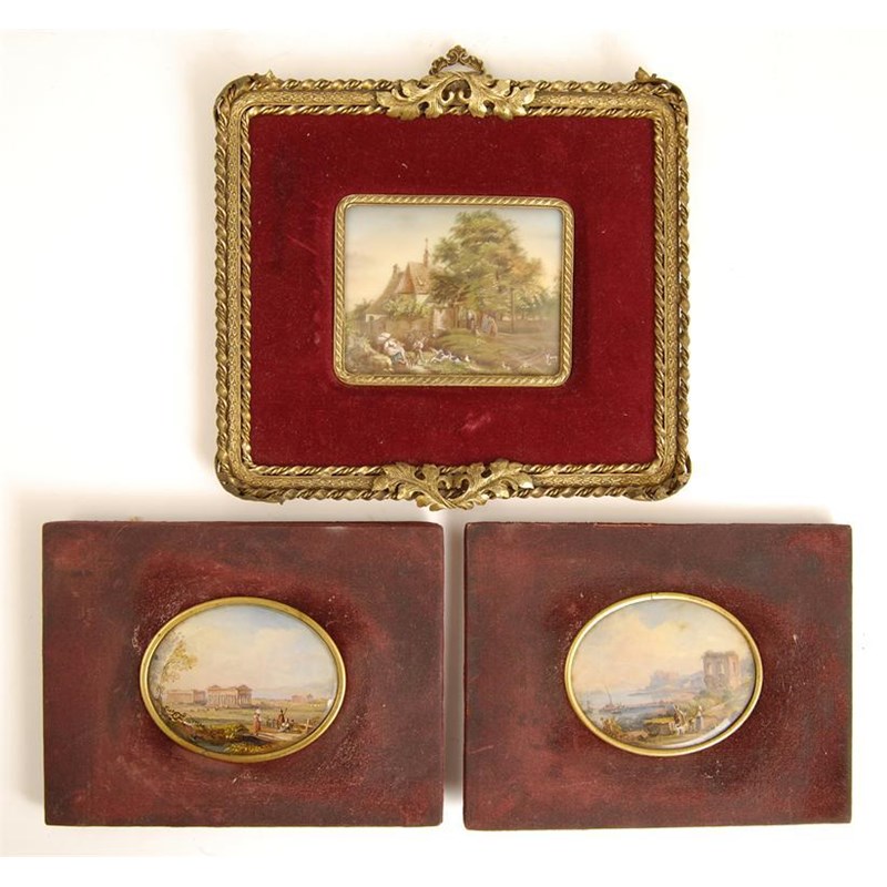 A pair of late 19th century Italian oval landscapes, View of the Valley of the Temples, Agrigento, Sicily and another coastal view, gouache, 2.25 x 3in (5.5 x 7.5cm) in leather frames with paper trade labels 'HALSTAFF & HANNAFORD, Manufacturers, 228 Regent St. LONDON' and a rural view signed 'Mary.' (3)