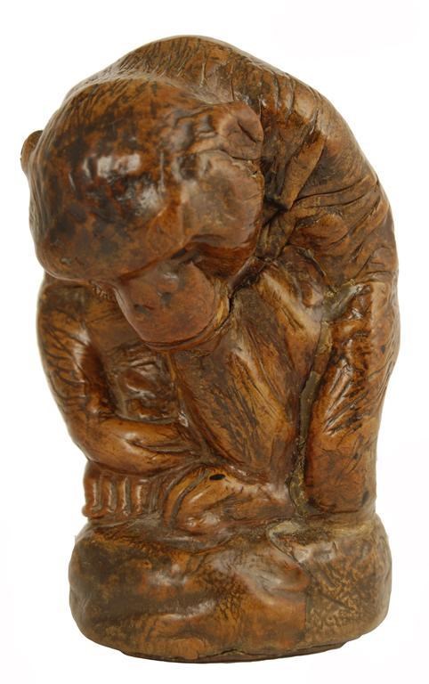 A leather covered model of a seated monkey, the base inscribed 'Hand Made in Leather H E Jackmann, Patronised by Her Majesty Queen Mary,' 5.75in (14.5cm) h.