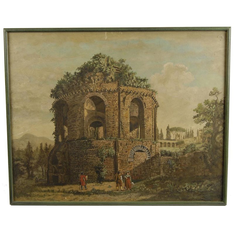 Two painted over engravings, 'The Tomb of Cecelia Metella' and 'The Ruins of an Aquaduct', 20.5 x 25.5in (52 x 65cm). (2)
