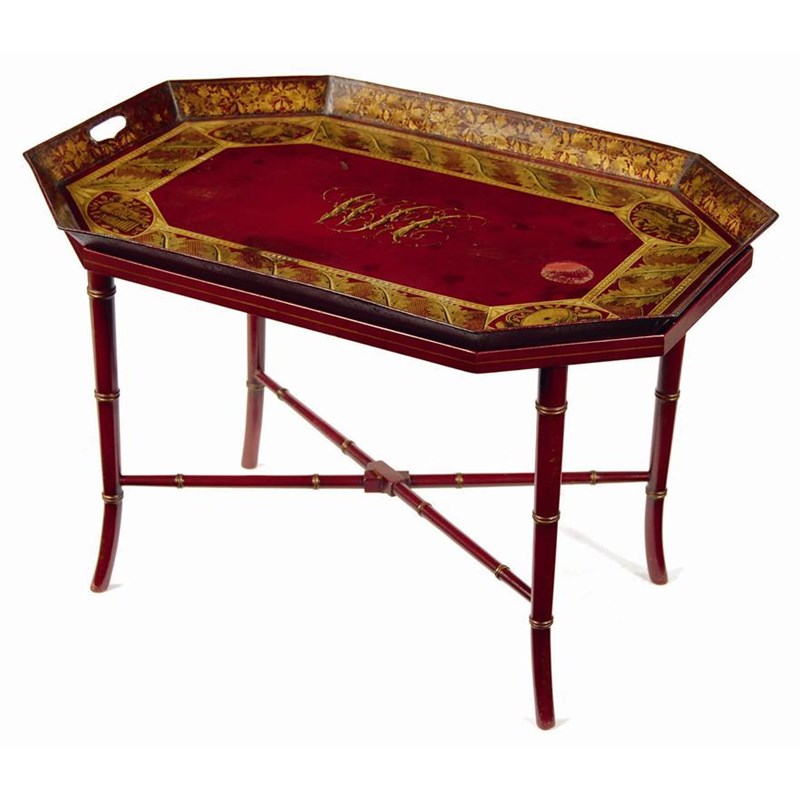 A Regency tole octagonal tray, on a later stand, gilt decorated with bands of leaves, the corners with musical instruments, 20in (50.8cm) h, 30in (76.4cm) w, 20.75in (52.6cm) d.