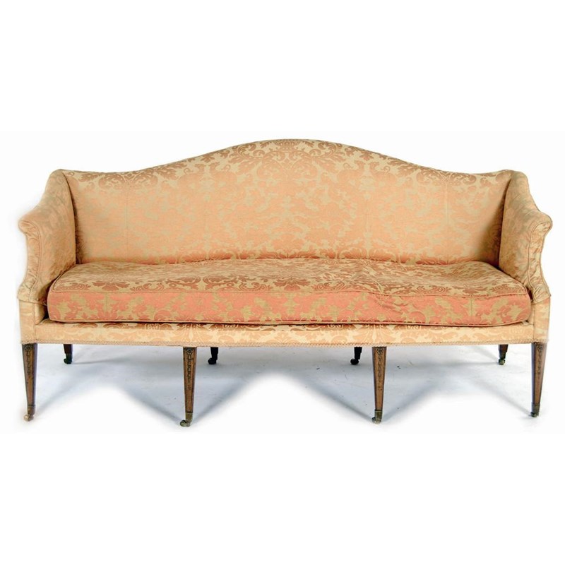 An Adam style settee, the arched back with scroll arms and a squab cushion upholstered in a patterned silk damask, on florets and husk carved square tapering legs to brass roller castors, 19th century and later, 37in (94cm) h, 76.5in (194.5cm) w, 30in (76cm) d.