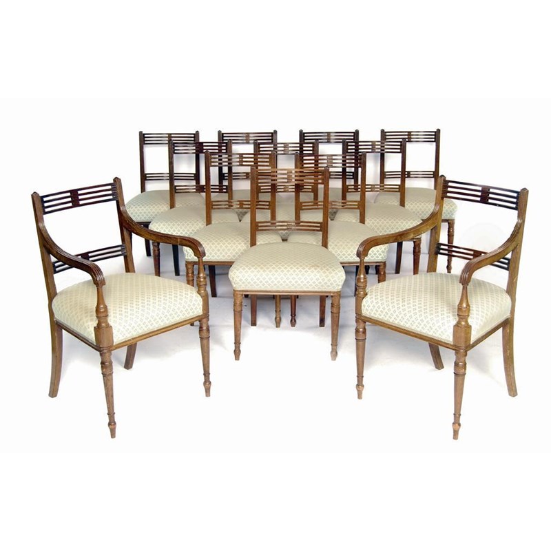 A set of twelve early 19th century mahogany dining chairs, with bowed reeded bar backs and reeded supports to stuffed over seats on turned tapering legs, comprising: a pair of open armchairs and ten side. (12)