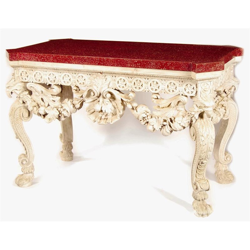 A carved wood and painted console table in George II style, with a faux marble top having squared corners above a leaf cornice and floret frieze with a central shell and fruiting swags, on griffen headed scroll legs with hairy paw feet, 35.5in (90cm) h, 55in (139.5cm) w, 29in (73.5cm) d. This table is a copy of an example at Ditchley Park, Oxfordshire.