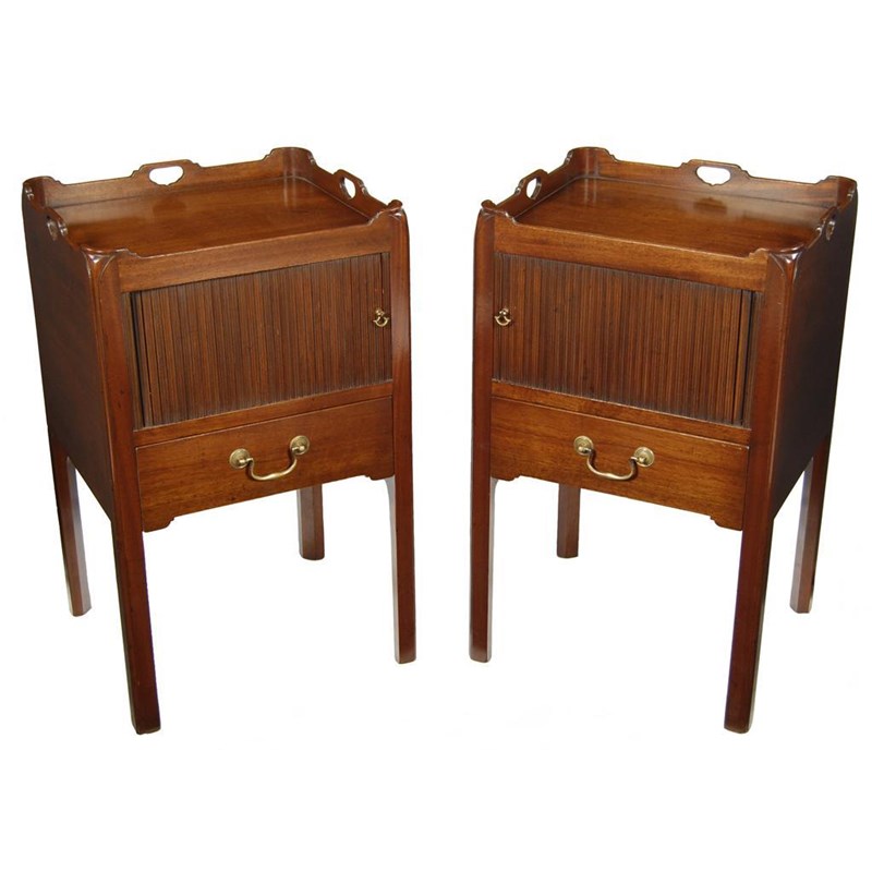 A pair of George III style mahogany 'tray top' bedside tables, each with a tambour shutter above a drawer, modern, 31in (78.6cm) h, 19in (48cm) w, 17in (43cm) d. (2)