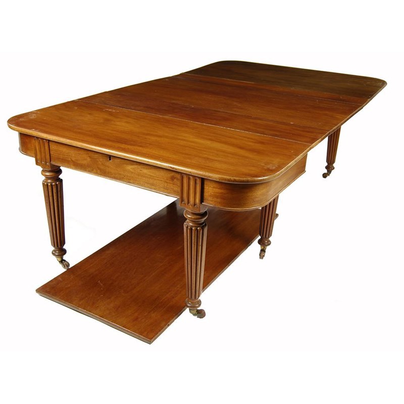 An early Victorian mahogany extending dining table, with a fold-over top and three extra leaves on a concertina scissor action frame with brass mounts, with a frieze drawer flanked by fluted headed turned tapering ribbed legs with ceramic castors, 28.5in (72.5cm) h, 116.25in (295cm) extended, 53in (134.5cm) w, 27.5in (70cm) d, closed.