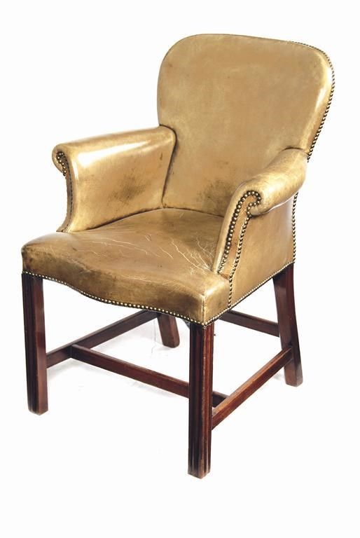 A brass studded and leather upholstered armchair, with scroll arms and a serpentine front seat on square chamfered and moulded mahogany legs, united by an 'H' stretcher, George III and later. Provenance: Burton Constable Hall, East Yorkshire. Burton Constable hall has been the seat of the Constable family for over 400 years. William Constable commissioned Thomas Chippendale to furnish the Great Drawing Room in 1775-76.